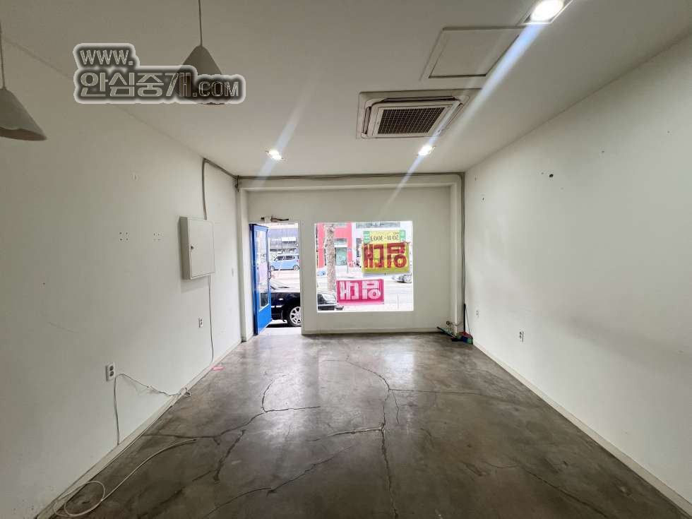 화이트톤 인테리어와 노출 바닥 느낌으로 감각적인 분위기를 갖춘 공간이며, 전면 통창으로 채광과 가시성도 좋습니다.